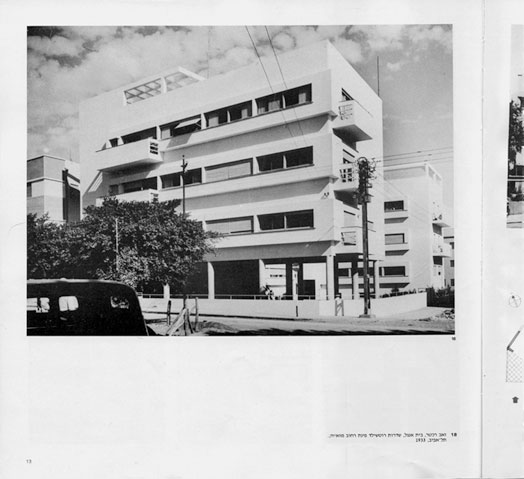Ил. 18. В каталоге выставки «Белый город» представлен идеальный Тель-Авив: дом Энгеля, построенный по проекту Зеева Рехтера на углу бульвара Ротшильда и улицы Мазе (Тель-Авив, 1933). Дом Энгеля – несомненно, наиболее знаковый из архитектурных образцов интернационального стиля в Тель-Авиве. Благодаря этому нововведению – здание приподнято и опирается на колонны-сваи – Тель-Авив, по словам Арье Шарона, стал «городом на колоннах». Тех, кто видел дом Энгеля в его первоначальном виде, осталось мало: траты на ремонт не были включены в бюджет, выделенный на рекламу Белого города после выставки Левина в 1984-м. С годами здание ветшало, и его первый этаж наглухо закрыли.