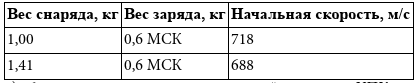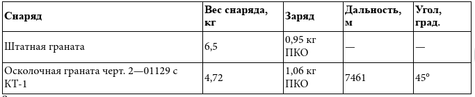 Осколочно-фугасная граната эталон 124 весом 6,23 кг, длиной 4,7 калибра. Вес взрывчатого вещества 0,73 кг. Взрыватель КТ-1.