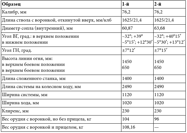 2) 76-мм противотанковая повышенной мощности УПК на колесном лафете. Вес системы 250 кг. При весе снаряда 6,5 кг начальная скорость 650 м/с, при весе снаряда 3,96 кг — 880 м/с.