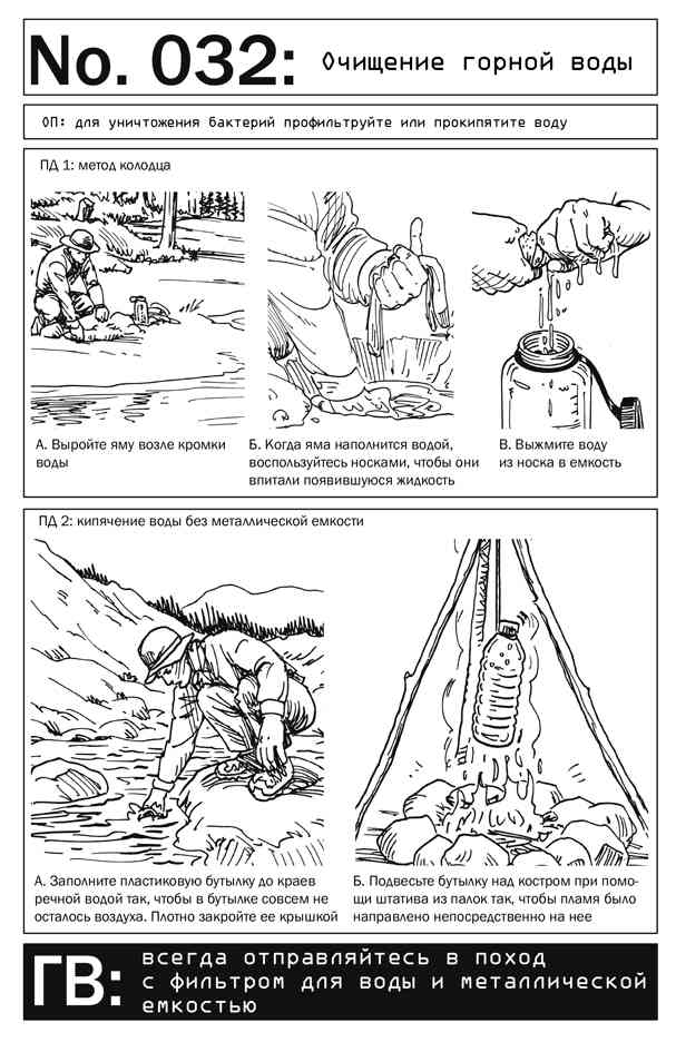 Как вы думаете, можно ли сделать хотя бы глоток кристально чистой родниковой воды в горах, не отфильтровав и не прокипятив ее? Если вы находитесь на достаточно большой высоте, вода там, как правило, чистая, но, может быть, в нескольких сотнях метров выше по течению купалось или испражнялось какое-нибудь животное, о чем вы никогда не узнаете. криптоспоридиоз, лямблиоз, шигеллез и норовирус — вот лишь некоторые из бактериальных, вирусных и паразитарных инфекций, которые могут возникнуть после употребления необработанной воды, а фильтрация или кипячение сведут риск к минимуму. Доведите воду до кипения, чтобы очистить ее, и пусть она продолжает кипеть в течение одной минуты плюс по одной дополнительной минуте на каждые 300 м высоты над уровнем моря — на всякий случай.