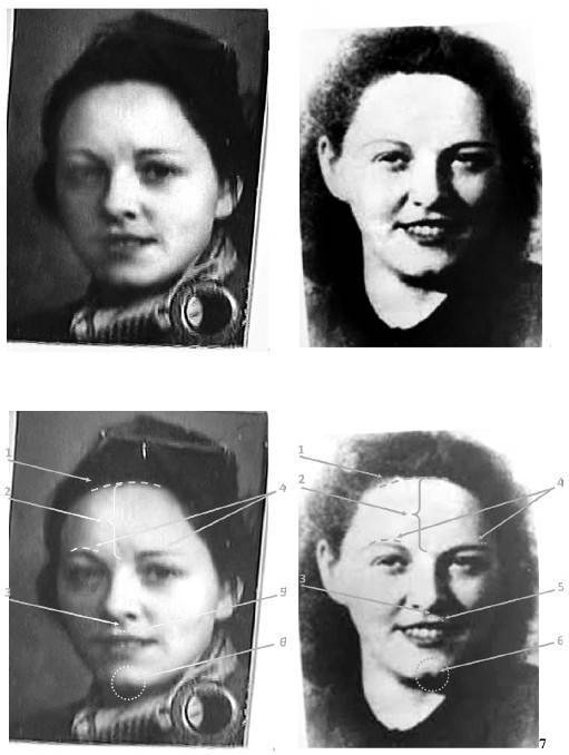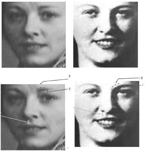Выявленные различия в высоте бровей (отм. 9), контуру и положению головки левой брови (отм. 8) объясняются, вероятно, низким качеством изображения на сравниваемых объектах и различием в положении головы сравниваемых лиц.