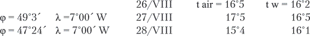? = 57°19? t = 18°,0, t воздуха в полдень 10 авг. 18°0, t воды 17°2. Дальше в нём: море t воздуха 15°3 – 18°0; воды 15°7 – 16°4. Здесь же: