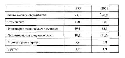 Образование. В каждом обществе элита — одна из наиболее образованных социальных групп. Даже в Брежневские времена, когда элита происходила из низов общества, доля тех, кто имел высшее образование, приближалась к ста процентам. Правда, определенная часть номенклатуры имела лишь высшее партийное или комсомольское образование, обучаясь в системе ВПШ и ВКШ. Бизнес-элита, родившаяся в конце 80-х годов, сразу сформировалась из весьма образованных людей. В 1993 г. в ее рядах находилось 93 % тех, кто имел высшее образование. Самыми распространенными специальностями были инженерно-технические (49 %). Два высших образования в 1993 г. имели 2,6 % предпринимателей; 37,0 % были кандидатами и докторами наук.[382]