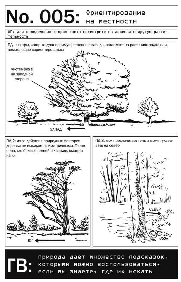 Умышленно или случайно, но природа сообщает внимательным людям множество подсказок об их местонахождении. Поскольку большинство ветров дуют с запада, у деревьев и кустарников листвы, как правило, больше на восточной стороне. А веток больше с южной стороны, так как именно она получает максимум солнечного света из-за наклона нашей планеты. Мох же, который лучше растет в тени, чаще встречается на северной стороне деревьев. Этой последней подсказкой нужно пользоваться осторожнее, чем другими: отдельное дерево может быть затенено соседними. Как и с любыми другими подсказками, убедитесь, что видите общую картину, и не делайте поспешных выводов.