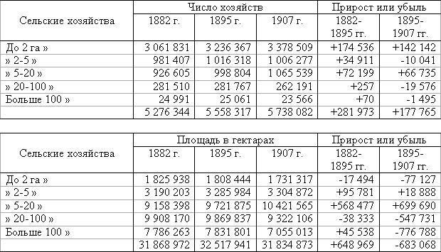 Из 5 736 082 хозяйств, имевшихся в 1907 году, не менее 4 384 786 имели менее 5 га, что составляет 76,8 процента всех сельских хозяйств, которые, за исключением садово-огороднических или имеющих превосходную почву, обеспечивают владельцу лишь скудное существование. Значительная часть их вовсе не может быть принята во внимание, так как среди них имеется 2 731 055 хозяйств с 1 га и менее.