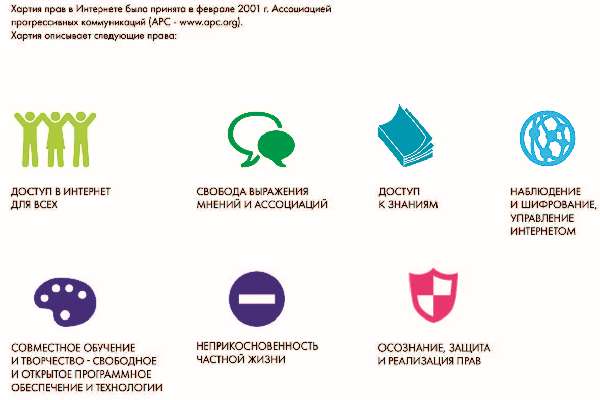 Хартия прав в интернете была принята в феврале 2001 года в Праге, на семинаре по правам в интернете, Ассоциацией прогрессивных коммуникаций (APC — www.apc.org) — общественной организацией, видящей свою цель в том, чтобы распространять доступ в интернет, а также «делать мир лучше» с помощью интернета. Хартия описывает следующие права: