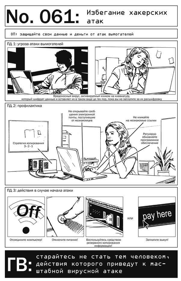 Чтобы не попасть в ситуацию, когда у вас не остается иного выбора, кроме как заплатить выкуп, нужно научиться предотвращать атаки вредоносных программ. Для этого регулярно обновляйте антивирусы, чтобы своевременно закрывать все выявляемые лазейки в системе обеспечения безопасности, и используйте стратегию резервного копирования 3–2–1, при которой информация сохраняется локально, на внешнем жестком диске и в облачной системе хранения данных. Не открывайте подозрительные сообщения в электронной почте и не кликайте на незнакомые ссылки. Будьте бдительны и пользуйтесь проверенными средствами, такими как типовой фоновый рисунок на компьютере и стандартизированный блок электронно-цифровой подписи для общения с членами семьи и коллегами. Спамеры часто проникают в организацию при помощи адресов электронной почты, похожих на адреса сотрудников. Если сообщение, полученное по электронной почте, не относится к известному вам проекту или не похоже на то, что вы обычно получаете от указанного отправителя, присмотритесь к адресу внимательнее. К числу широко применяемых уловок этого рода относятся неправильное написание имени пользователя или замена доменного имени.