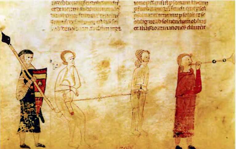 Илл. 3 — Наказание за адюльтер «бегом». «Кутюмы Ажена» (Agen, Arch, dep., Ms. 42, fol. 40v). Ажен, сер. XIII в.