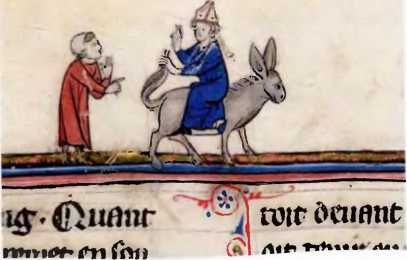 Илл. 8 — Священник на осле. Миниатюра из: Le Livre de Lancelot du Lac (Yale University, Beinecke Rare Book and Manuscript Library. Ms. 229, fol. 104v). Северная Франция, кон. XIII в.