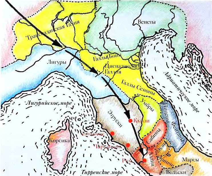 Название кельты, так же, как и галаты, восходит к греческой традиции, в то время как по романской традиции этот этнос назывался галлами. В контексте мощного миграционного потока во всех направлениях во второй половине V в. до н. э. некоторые из этих племен, преодолев альпийские перевалы, спустились также в Италию. Благодаря торговым связям они хорошо знали о производимых здесь товарах, мягком климате и плодородности земель Апеннинского полуострова. Племена инсубры, лепонтийцы и ценоманы расселились к северу от реки По; бойи, лингоны и сеноны перешли реку По и захватили этрусские города Фельсина (Болонья) и Марзаботто, расселившись затем по всей Эмилии и вдоль Адриатического берега от Равенны до Анконы. Менее горькая судьба постигла, по сравнению с этрусками, которые вынуждены были покинуть свои цветущие города, основанные на Паданской равнине, местные племена на севере, где лигуры с запада и венеты с востока смогли противостоять галльскому нашествию.