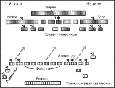 Обе армии выстроились напротив друг друга – этот процесс, вероятно, потребовал нескольких часов. Александр разместил основные силы своей кавалерии на правом фланге (см. рис. «1-й этап») и сам остался именно здесь. Задачей Пармениона стало командование более слабым левым флангом. Поскольку персы, имея больше воинов, могли обойти македонян с флангов, Александр принял беспрецедентное решение: оставил позади флангов «свободные крылья» из пехоты и кавалерии и выстроил позади основных сил греческих наемников. При худшем раскладе его армия могла бы образовать квадрат, окружив противника.