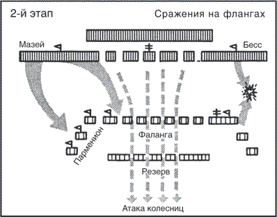 Когда армии начали сближаться, Александр обнаружил, что его лучшие всадники – «спутники» (гетайры) – оказались напротив персидских колесниц, так что он отклонил линию атаки вправо. Чтобы задержать это продвижение, персидская конница перешла в наступление на обоих флангах (см. рис. «2-й этап»). Бесс ворвался в крыло Александра, Мазей теснил Пармениона и сдерживал продвижение двух полков македонских фаланг. Примерно в этот момент Дарий приказал серпоносным колесницам атаковать, однако его секретное оружие было использовано слишком быстро. Македонская легковооруженная пехота остановила многие из них, используя длинные копья. Основные отряды пехоты еще не были введены в бой полностью, поэтому разомкнули ряды, чтобы колесницы прошли сквозь них, причинив минимальный вред.