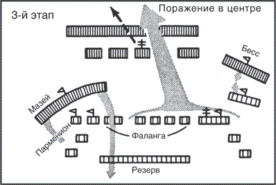 Тем временем персидский центр испытывал большое давление, часть его воинов была вовлечена в битву на левом фланге, другая двигалась навстречу Мазею. В этой битве Александр проявил выдающийся талант полководца, поскольку в разгар сражения не потерял головы и в нужный момент бросил гетайров прямо в слабое место персидского центра. Позади его кавалерии шла основная масса македонской пехоты. Дарий развернул свою колесницу и бежал, персидский центр был смят.