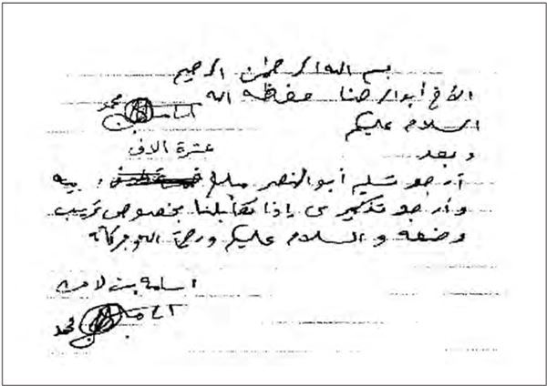 Пожалуйста, предоставьте денежную сумму в десять тысяч рупий [первоначальная цифра была пять тысяч, зачеркнутая и исправленная; чтобы подтвердить это исправление, Бен Ладен поставил свою подпись над этой помаркой] брату Абу аль-Насру и напомните мне, когда мы с вами встретимся, что надо исправить ту ситуацию, в которой он оказался.