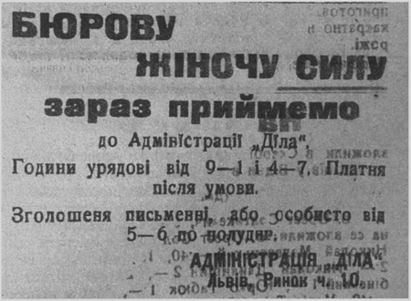 У газетних оголошеннях жінки могли «говорити» про себе. Повідомлення стосувалися двох тем — пошуку роботи чи реклами власної продукції і пошуку нареченого. Здебільшого українки хотіли влаштуватися хатніми робітницями, наголошували на працьовитості й умінні організувати господарство. До професійної праці зголошувалися рідше. Львів’янка Текля у 1917 році пропонувала послуги масажистки, зазначала, що «виконує всї масажі і гідропатії, ставляє баньки і пявки». Ринок праці потребував не домашніх господинь, а працівниць до офісів. Роботодавці вимагали від жінок знання іноземних мов — польської, німецької, а також «писання на системі машини Адлер». Через оголошення українки робили спроби влаштувати особисте життя. Майбутній чоловік мав відповідати фінансовому становищу дружини. Деколи жінки шукали інвалідів війни, оскільки очікували від шлюбу стабільності — фінансової (інваліди отримували грошову допомогу), статусної й безпекової (таких чоловіків більше не призивали до війська). Чоловіки ж здебільшого шукали молодих, освічених, господарних жінок (іноді молодих вдів, але без дітей). Важливим був і матеріальний бік — особливо коли чоловік мав намір відкрити власну справу.