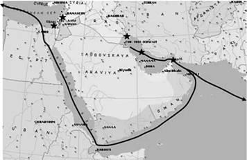 Основная часть нефти и газа Залива идет через Ормузский пролив и Оманский залив и далее в Европу вокруг Аравийского полуострова, через Баб-эль-Мандебский пролив, Красное море, Суэцкий канал и Средиземное море, а в Азию – через Индийский океан (рис. 2).