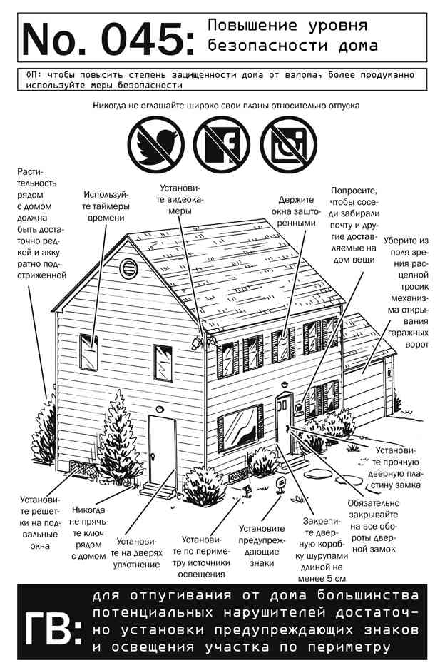 Чтобы помешать наблюдению со стороны за вашим домом и происходящим в нем и чтобы нежелательные наблюдатели не смогли составить полного представления о ваших привычках и распорядке дня (пусть они об этом гадают), независимо от того, находитесь вы дома или нет, держите окна как можно чаще зашторенными. Паркуйте автомобиль в гараже и закрывайте и запирайте в нем дверь (см. раздел 046). Использование подъездной дорожки как места для парковки дает злоумышленникам слишком много информации о вашем образе жизни.