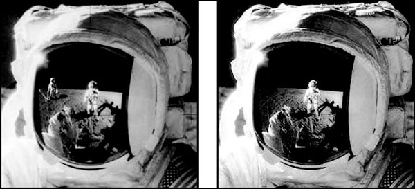 – А как на Луне оказались сразу трое астронавтов? Ведь на Луне их больше двух никогда не было, один всегда оставался в орбитальном модуле! Вот посмотрите: рисунок 64 – фрагмент фотографии, четко видно, что в стекле шлема астронавта отражаются еще двое. А на рисунке 65 – фрагмент этой фотографии с сайта NASA, на которой после ретуширования стало, как полагается, два человека – один и отражение другого в стекле.