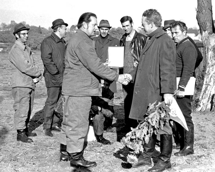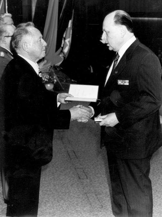 Глава МГБ ГДР генерал-полковник Эрих Мильке вручает серебрянную медаль подполковнику Шпаковсому. Главное управление разведки Штази. Берлин. Рушештрассе. 1987 год