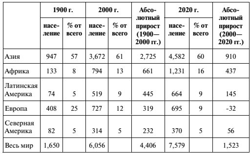 Если рассматривать глобализацию как естественное следствие всемирной технологической революции, а не как доктринальную дискуссию, она приводит к весьма актуальной проблеме глобальной миграции. Приведенные в таблице данные показывают нарастающий демографический дисбаланс между богатыми Европой и Америкой и более бедными Азией, Африкой и Латинской Америкой.