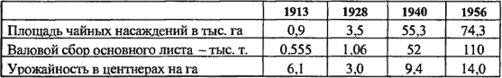 Мы видим, что в 1928 году урожайность сильно упала, но потом быстро поднялась. По отношению к дореволюционному уровню урожайность 1940 года возросла в 1,54 раза и сделала новый подъем от 1940 к 1956 г. в 1,57 раза. Видимо, таким образом, что в нормальные годы урожайность продолжает возрастать с очень хорошим темпом. Кстати, видимо, в справочнике «Ежегодник БСЭ, 1957 г.» вкралась ошибка, так как там на с. 126 в отношении Грузии (основной республики, производящей чай в СССР) сказано, что урожайность 1956 года составляет 103% по отношению к урожайности 1940 года.