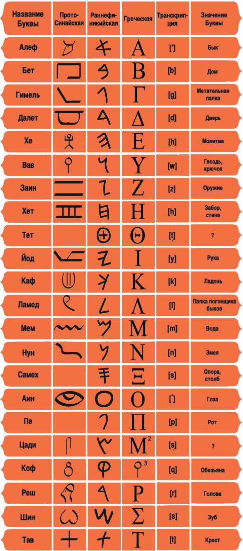 Древнее семитское происхождение нашего письма даже спустя тысячелетия проследить несложно. Буква А когда-то обозначала быка с рогами, по-семитски «alp» (отсюда греческое название «альфа»); буква Б, греческая «бета», – не что иное, как вид дома и дворика с птичьего полёта, ведь «дом» по-семитски «bet». При желании в букве М всё ещё можно разглядеть рябь на воде (по-семитски mayim – «вода»), а в букве О – глаз (по-семитски «en»). Эти и некоторые другие знаки первого семитского алфавита графически представляют собой адаптацию древнеегипетских иероглифов. Из Египта сквозь тысячелетия в наш алфавит вошла и буква Ш, происходящая из иероглифа со значением «затопленное поле», которые в древнеегипетском языке тоже читался «ша». Её внешний вид почти неизменным сохранился и в кириллице, и в арабском, и в еврейском, и в коптском алфавитах.