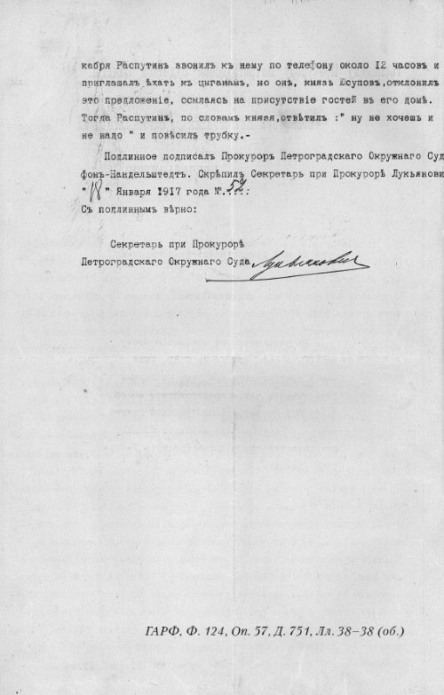 А про Распутина слышал и знаешь?“ Я заявил, что его не знаю, но слышал о нем. Неизвестный тогда сказал: „Вот он (т. е. Распутин) погиб, и если ты любишь царя и Родину, то должен об этом молчать и никому ничего не говорить“. „Слушаю“. „Теперь можешь идти“. Я повернулся и пошел на свой пост. В доме была тишина, и, кроме князя, неизвестного и Бужинского, я никого не видел»[88].