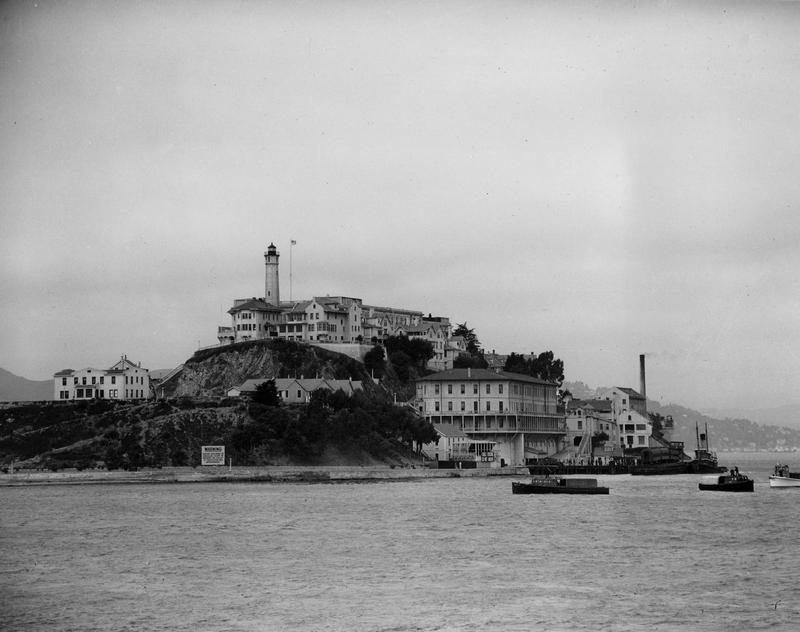 Три бронированных железнодорожных вагона прибывают на автомобильном пароме в исправительную колонию Соединенных Штатов на острове Алькатрас, Сан-Франциско, штат Калифорния, 22 августа 1934 года. Под пристальным взглядом вооруженных охранников заключенные, в том числе бывший глава банды Чикаго Аль Капоне, покидают вагоны для переезда в камеру.