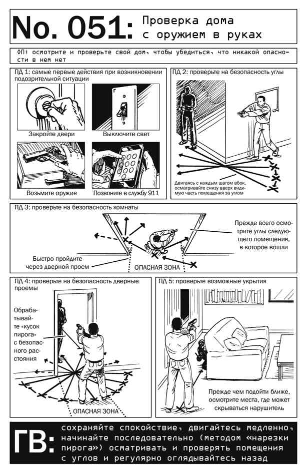 Продвигаясь вдоль стен и держа оружие в руке, медленно и спокойно осмотрите все углы. Проверяйте их методом «нарезки пирога», которым пользуются военные. Он позволяет быстро и безопасно оглядеть всю комнату, делая для этого шаги в сторону и двигаясь по полукругу, из-за чего противник не может неожиданно напасть на вас. Смотрите и направляйте ствол в ту сторону, в которую двигаетесь, и проверяйте каждый «кусок пирога», переводя взгляд и дуло пистолета снизу вверх.