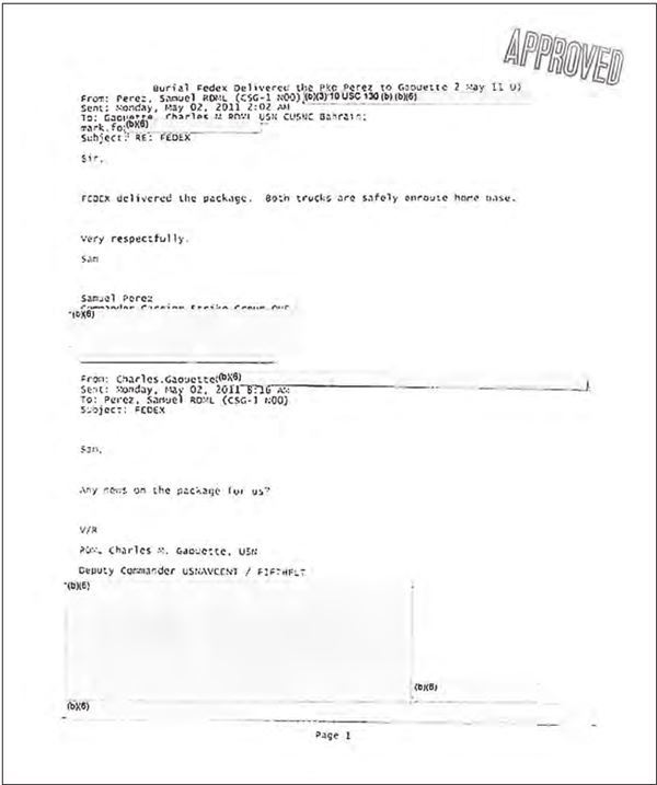 Документ № 45 ОБМЕН ЭЛЕКТРОННЫМИ СООБЩЕНИЯМИ МЕЖДУ ДВУМЯ ВЫСОКОПОСТАВЛЕННЫМИ АМЕРИКАНСКИМИ ВОЕННЫМИ ПО ПОВОДУ «ДОСТАВКИ» ОСТАНКОВ БЕН ЛАДЕНА