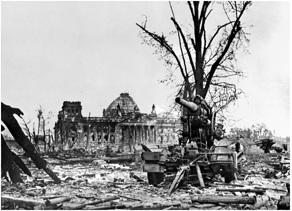 После штурма Рейхстага. На переднем плане 88-мм зенитка на транспортных тележках (иногда стреляли даже в такой конфигурации). На заднем плане такая же зенитка в боевом положении