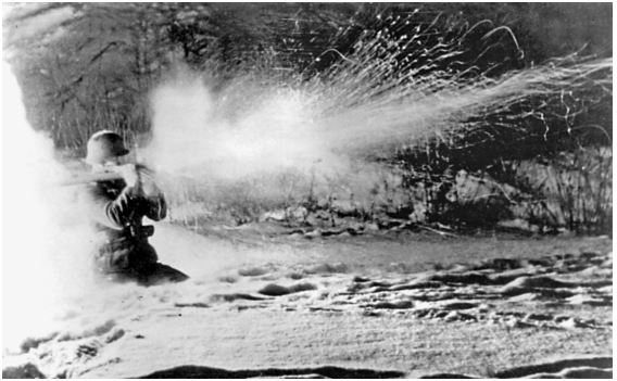 Выстрел из фаустпатрона. Хорошо виден выброс пороховых газов с тыльной стороны трубы гранатомета