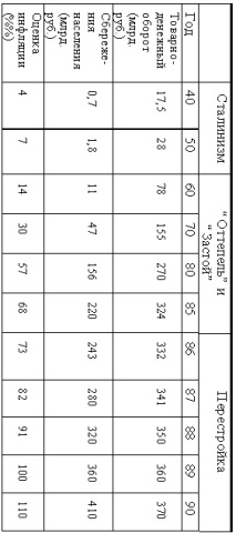 Посмотрим на экономику и обратимся к таблице. В условиях господства государственной собственности на средства производства и произведенную продукцию, хорошей оценкой инфляции является отношение денежных сбережений граждан к объему годового оборота розничной торговли и сферы услуг. Из таблицы видно, что оценка инфляции[69] каждое десятилетие практически строго удваивалась. Смена официального высшего руководства и объявление многочисленных реформ и кампаний этот процесс не затрагивала. Если судить по этому процессу, то остается сделать вывод, что и высшая власть в стране не менялась.
