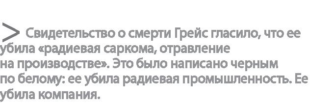 Конец ее страданиям настал 27 октября 1933 года. Она скончалась в восемь утра, в каком-то смысле в удачное время для врачей, только что вышедших на смену. Благодаря этому доктор Мартланд смог провести вскрытие, в последний раз внимательно осмотрев своего самого особенного пациента. Свидетельство о смерти Грейс гласило, что ее убила «радиевая саркома, отравление на производстве». Это было написано черным по белому: ее убила радиевая промышленность. Ее убила компания.