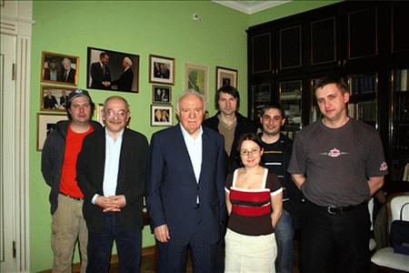 В мае 2008 года в ходе нашей киноэкспедиции мы побывали в Тбилиси и нам удалось встретиться с бывшим президентом Грузии Эдуардом Шеварднадзе. Как известно, после отставки Эдуард Амвросьевич жил в своей загородной резиденции, неподалеку от грузинской столицы. В момент, когда мы приехали, его дом был блокирован так называемыми «черными колготками» – страстными сторонницами Звиада Гамсахурдии, смещенного в свое время с поста президента Грузии Эдуардом Шеварднадзе и вскоре таинственно погибшего где-то в лесах Мегрелии. Женщины дружно скандировали: «Шеварднадзе – террорист!» и не хотели пропускать наш микроавтобус, спрашивая, с какого мы канала. Мы честно ответили, что с Пятого. О существовании Пятого российского канала, вещающего из Санкт-Петербурга, фанатички не подозревали, но знали, что такой канал есть на Украине. Они начали стыдить нас, как это мы, журналисты из братской Украины (тогда в Киеве правили Ющенко и Тимошенко), едем в гости к террористу Шеварднадзе. Впрочем, их убедил аргумент о журналистском долге и успокоило наше мнимое украинское происхождение.