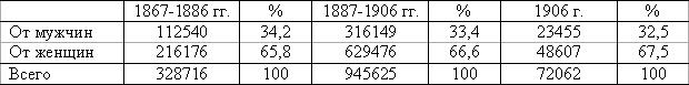 Мы видим, таким образом, что женщины предъявляют требования о разводе больше чем на две трети из общего количества всех требований,[100] подобную картину дает нам Италия. Там было удовлетворено требований о разводе в 1887 году 1221 и в 1904 году — 2103. Ходатайства о разводе в соответствующие годы подавали: женщины — 593 /и 1142, мужчины — 214 и 454, и те и другие вместе — 414 и 507.