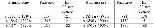 Из ста тысяч заключенных браков было расторгнуто в Пруссии в среднем за год: 1881–1885 годы — 67, 62; 1886–1890 годы — 80, 55; 1891–1895 годы — 86, 77; 1896 год — 101,97; 1905 год-106; 1908 год — 121 брак.