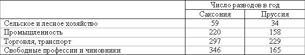 Разводы, таким образом, чаще всего встречаются в Саксонии в мире чиновников и людей свободных профессий, в Пруссии — в мире торговли и транспорта. Следующее место занимают: в Саксонии — торговля и транспорт, в Пруссии — чиновники и свободные профессии. Промышленность с ее цифрами: 220 для Саксонии и 158 для Пруссии — занимает третье место. На последнем месте стоит сельское хозяйство! Все растущее число разводов среди городского населения по сравнению с сельским говорит о том, что в общем вместе с растущей индустриализацией общества и падением устойчивости общественной жизни брачные отношения становятся все более шаткими, а факторы, разрушающие брак, все увеличиваются.