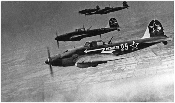 Штурмовики Ил-2 над немецким городом. Самолеты этого типа составляли основу советской ударной авиации