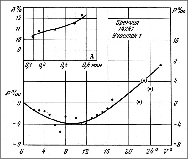 Рис. 25. Брекчия 14267. Остальная поверхность. Альбедо и кривая поляризации