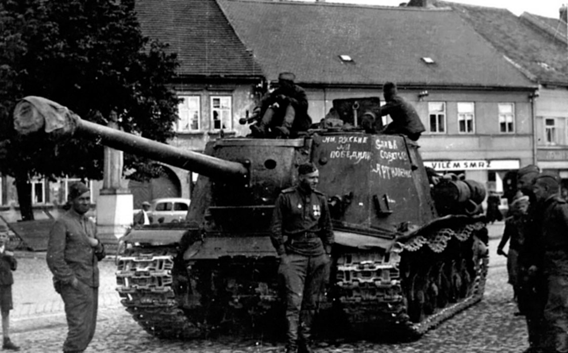 Советская САУ ИСУ-122с на одной из улиц города Собеслава в Чехословакии. Надписи на самоходке: «Мы русские, мы победили» и «Слава советским артиллеристам!»