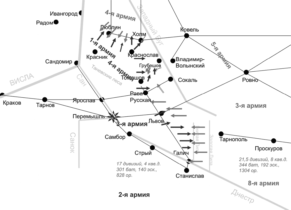 Мы оставили генерала Эверта в момент отхода к Люблину. Четвертая армия находилась в неважном состоянии, но австрийцы вели преследование достаточно медленно, поэтому оперативная конфигурация постепенно восстановилась. На правый фланг армии вышел 18-й корпус, который завязал бои с группой Куммера и принудил ее перейти к обороне. Четырнадцатый корпус, хотя и с трудом, удержал свои позиции. С 29 августа центр тяжести сражения смещается к югу, где 5-й и 10-й австрийские корпуса атакуют 16-й и гренадерский корпуса русских, пытаясь одновременно еще и продвинуться к Краснославу для оказания содействия 5-й армии: увлечение Ауффенберга сложной и длительной операцией на окружение начинает оказывать негативное воздействие на армию Данкля, усилия которой раздваиваются.