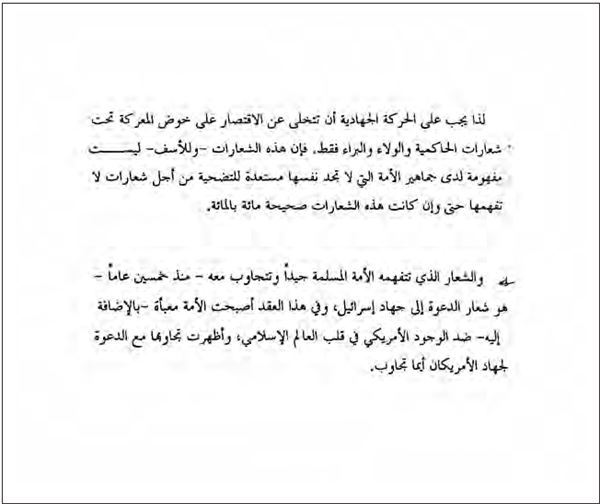 Бен Ладен, в частности, приказывает сделать упор на призыв к джихаду против Израиля и США, считая, что только эти два лозунга способны мобилизовать исламскую нацию.