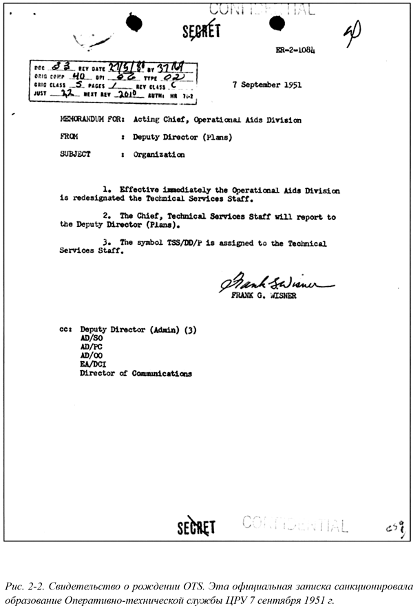 Даллес утвердил эти рекомендации и создал техническую службу TSS (Technical Services Staff) с полномочиями и правами, эквивалентными аналогичным службам других оперативных подразделений ЦРУ{80}. 7 сентября 1951 г. Директорат планирования формально объявил о создании TSS, небольшого подразделения, насчитывающего около 50 офицеров во главе с Джеймсом Драмом. В течение последующих двух лет спрос на изделия и услуги TSS возрос настолько, что его штат расширили более чем в пять раз. TSS существовал до июля 1960 г., а затем была переименован в TSD (Technical Services Division).