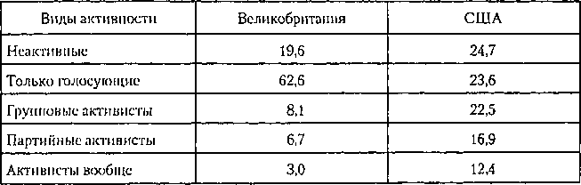 «Только голосующие», как правило, не участвуют больше ни в каких других видах деятельности (сюда входит большинство взрослых британцев, предпочитающих эту самую простую форму поведения). Из табл. 2 видно, что «групповые активисты», например, больше представлены в США, чем в Великобритании. «Партийные активисты» или «участники кампаний» составляют также в Англии меньшую долю, чем в США[448].