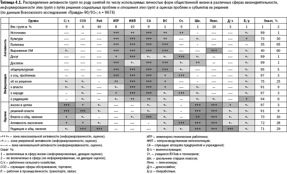 Самое главное в другом. Группы служащих аппарата предприятий и учреждений и незанятой на производстве интеллигенции в 1969 г. уходят от ответов на вопросы-оценки. Они боятся ставить отметки органам власти и населению, расценивая эти вопросы как политически острые и увеличивают число «затрудняющихся дать оценку». Молодежь до 25 лет, среди которой преобладают студенты, будучи максимально охваченной институтами пропаганды и не участвуя в процессе выражения мнений, ставит оценки по всем параметрам выделенного контура выше средних. Здесь ощущается влияние идеологического воздействия. Молодежь же от 25 до 29 лет, состав которой расписан выше, а также пенсионеры и домохозяйки, стучась во все органы власти для решения своих проблем (жилья, детей, здравоохранения и дошкольных учреждений), не получают должного их решения и ставят органам власти «колы» и «двойки» по всем параметрам, завышая оценки компетентности и активности населения. Характерно, что группы непроизводственной интеллигенции, служащих аппарата предприятий и учреждений и инженерно-технических работников склонны, как нами было указано ранее к информационному обмену: получение и сообщение сведений, а указанные группы молодежи, пенсионеров и студентов к решению вопроса по существу. При этом превращенная форма сознания (страх из 30-ых годов) наиболее сильно поражает непроизводственную интеллигенцию, тогда как ИТР и незначительная часть служащих аппарата предприятий, занимающие в социальной и политической стратификации в то время верхние этажи, как раз по ряду параметров (ИТР почти по всем) завышают оценки общественной активности власти и населения. Мы не рискнули расписывать так подробно эти параметры в главе 1, так как жесткие ограничения наших программ на доверительный интервал не позволяли на массиве из 1021 человека однозначно интерпретировать данные в 90 % доверительном интервале (табл. 1.7, гдеописанная дифференциация скрывается за знаками, фиксирующими умеренную активность, а поляризация групп происходит на доверительном уровне ниже 80 %). Однако, на массиве-«десятитысячнике» (табл. 4.1) служащие аппарата предприятий и учреждений, студенты, школьники выпадают в эти же ячейки при 95 % доверительном интервале. Проект «Общественное мнение» является, таким образом, неоценимым пилотажным исследованием, информация которого подтверждается именно при рассмотрении фундаментальных параметров социальной системы.
