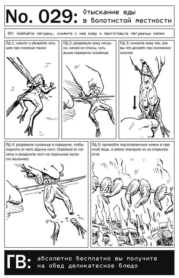 Хотя болота с их застойной водой зачастую имеют неприглядный вид, их биологически разнообразная среда служит местом обитания множества растений и самых разных живых существ — от рептилий, рыб и земноводных до птиц и насекомых, звуки которых слышны повсюду. Одним из земноводных, обитающих в огромном количестве во многих видах болот, является лягушка, которая проточной воде предпочитает стоячую. Это существо, ножки которого считаются деликатесом, совсем несложно поймать. В походных условиях эти ножки можно поджарить на вертеле.