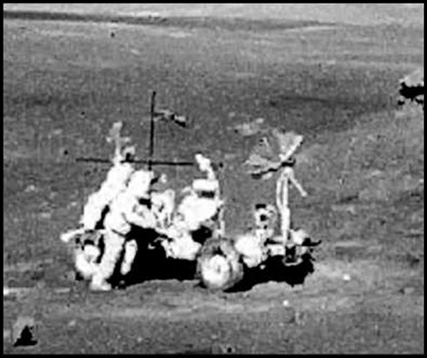 Ю.И. МУХИН. Вы, наверное, уже обратили внимание, что чем мельче вопрос, тем старательнее его жуют хиви. Ведь данное произведение НАСА должно иметь основательный вид, вот мы и узнаем из него много разного – от чепухи, типа пребывания американских астронавтов на Апеннинах, до всяких фотографических подробностей. Но между тем демонстрируемые в подтверждение фотографии по-прежнему бьют в глаза своей фальшивостью. Какая разница, перед луноходом крестик или за ним, ведь ни луноход, ни астронавт возле него практически не отбрасывают тени, вернее, отбрасывают ее под себя, т. е. освещаются чуть ли не под углом в 90°. А это значит, что это тень не от Солнца, а от прожектора, и, следовательно, нам снова всучивают очередную фальшивку.