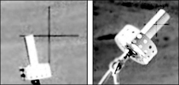 Теперь сравним предыдущее изображение с фрагментом другой фотографии: AS17-146-22296 (www.hq.nasa.gov/office/pao/History/alsj/a17/as17-146-22296.jpg) (рис. 59), на котором изображена аналогичная деталь «луномобиля». Здесь ясно видно, что линии крестика исчезают на ярко освещенных местах этой детали, но в тени – хорошо видны. Что же получается – крестик находится частично перед деталью, а частично – за ней?