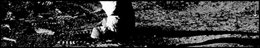 Справа от астронавта тень от древка достаточно хорошо видна – тонкая прямая линия чуть выше тени от его ног. Она особенно заметна у правого края кадра (отмечена стрелкой). А слева от него, где пыль покрыта множеством следов, тонкую тень от флагштока не разглядеть – по крайней мере, на размещенных в Интернете фотографиях. Дело в том, что там небольшой уклон в сторону от фотографа и тень «прячется в складках местности». Этот уклон заметен на другой фотографии (рис. 62) флага (AS11-40-5905), сделанной с другой точки (немного левее).